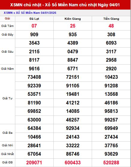 Kết quả xổ số miền Nam (XSMN) Chủ nhật ngày 04/01/2026 đã chính thức được công bố với ba đài quay thưởng gồm Đà Lạt, Kiên Giang và Tiền Giang. Mỗi tỉnh mang đến những bộ số khác nhau, trong đó có nhiều chi tiết đáng chú ý ở giải đặc biệt, các cặp số đẹp và xu hướng đầu – đuôi nổi bật. Cùng điểm qua những nét chính trong bảng kết quả của từng tỉnh ngay sau đây.